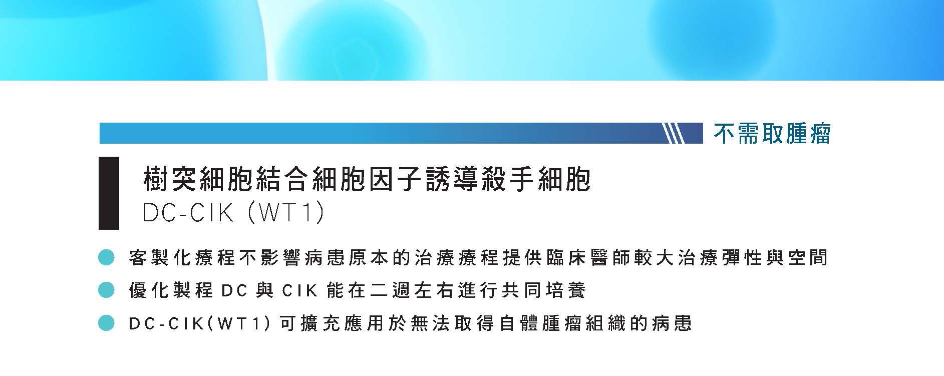DC-CIK(WT1)可擴充應用於無法取得自體腫瘤組織的病患,給予臨床醫師較大治療彈性與空間,不但優化製程DC與CIK能在二週左右進行共同培養,客製化的療程不會影響病患原本的治療療程。