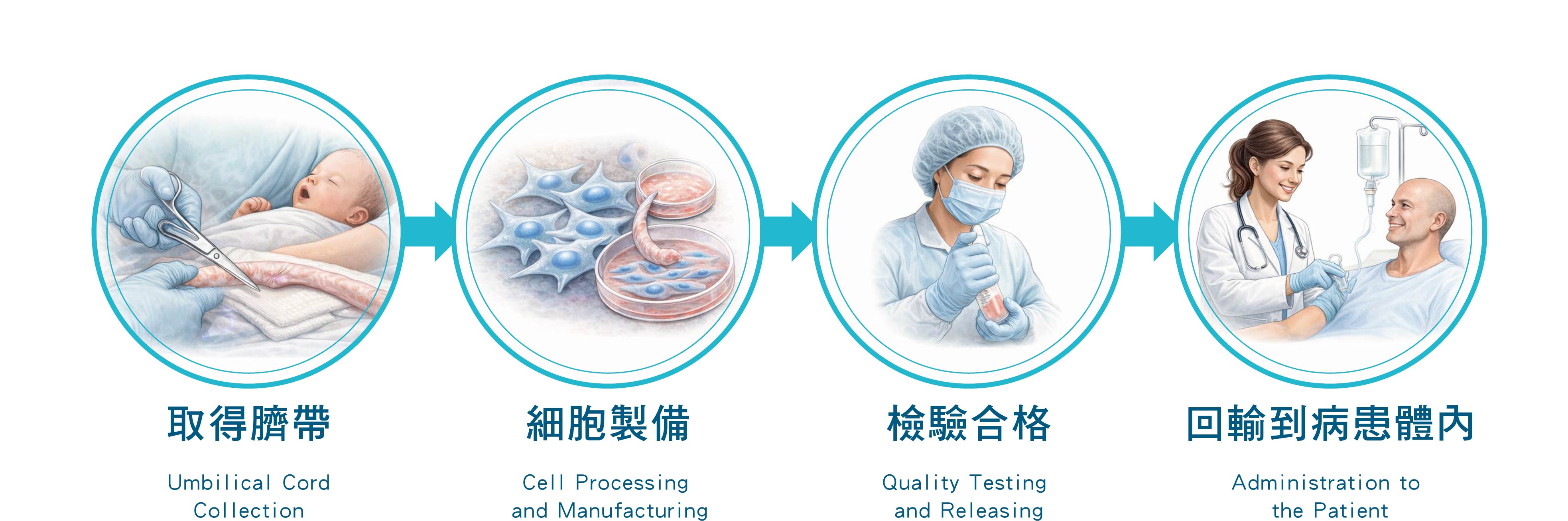 本流程說明臍帶間質幹細胞自來源取得、製備、品質檢驗,至回輸病患體內之完整步驟,確保安全性與品質一致性。